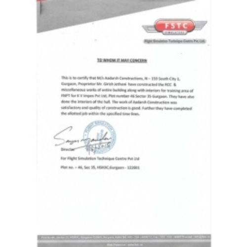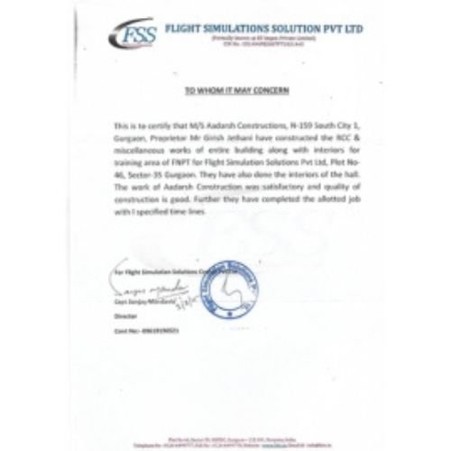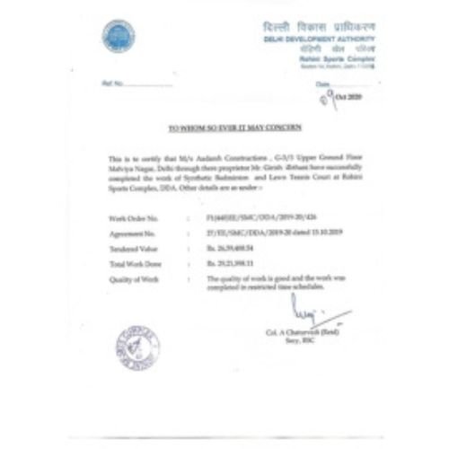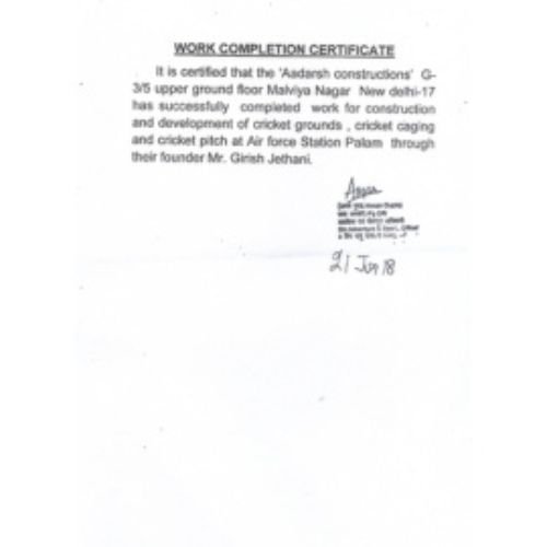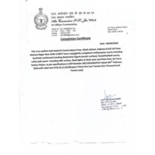 Certificates Certificates Certificates INTERIOR CONSULTANCY AND WORK COMPLEION CERTIFICATE COMMERCIAL BUILDING COMPLETION CERTIFICATE AIR FORCE PALAM CRICKET GROUND WORK COMPLETION CERTIFICATE FLIGHT SIMULATION SOLUTION COMPLETION CERTIFICATE INDIAN AIR FORCE FUTSAL AND BADMINTON FIELD COMPLETION 1 DDA ROHINI SPORTS COMPLEX CERTIFICATE 1 WORK COMPLETION CERTIFICATE DDA SPORTS DIVISION 1 DWARKA PRITAMPURA COMPLETION AND WORK ORDER DWARKA FLYOVER WORK ORDER AND COMPLETION